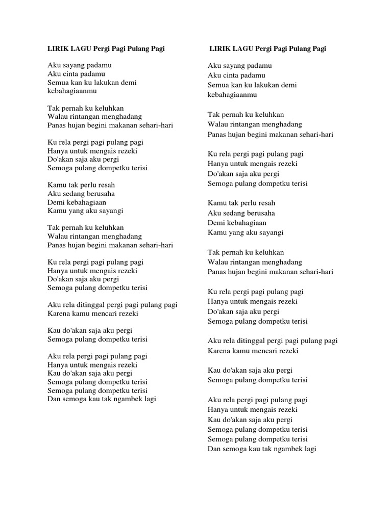 Aku rela pergi pagi pulang pagi hanya untuk mengais rezeki kau do akan saja aku pergi semoga pulang dompetku terisi semoga pulang dompetku terisi dan semoga kau tak ngambek lagi. Doakan saja aku pergi s moga pulang dompetku terisi kamu tak perlu resah aku sedang berusaha. Lirik pergi pagi pulang pagi dari armada band ini dipublikasikan pada tanggal 24 juli 2014 6 tahun yang lalu dan diciptakan oleh rizal radha single ini didistribusikan oleh label e motion.