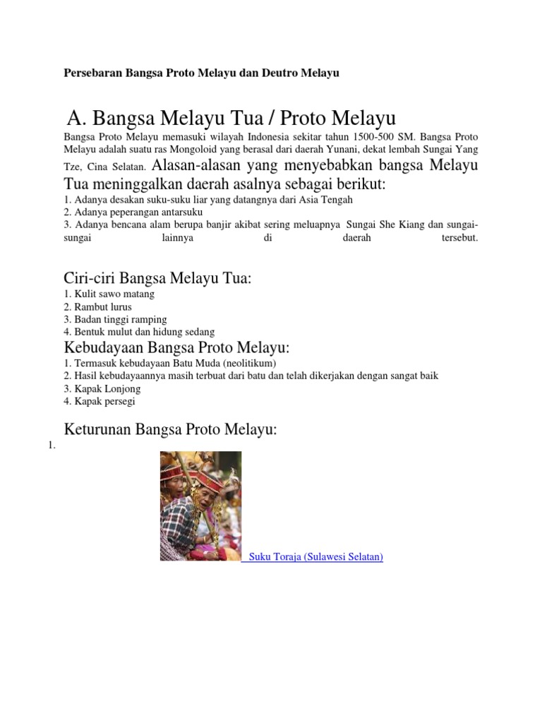 Kemudian pada rasa dijuluki sebagai melayu tua hal ini disebabkan oleh mereka datang lebih dahulu dari pada deutro. Ciri ciri ras deutro melayu. Penghunian manusia di tanah melayu indonesia dan malaysia khususnya di sumatera dan semenanjung telah berlangsung sejak ribuan bahkan jutaan tahun yang lalu.