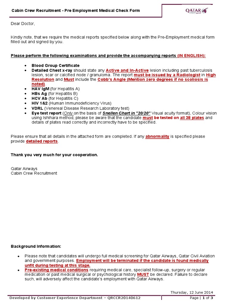 Cabin Crew Recruitment Pre Employment Medical Check Form Visual Acuity Hepatitis C