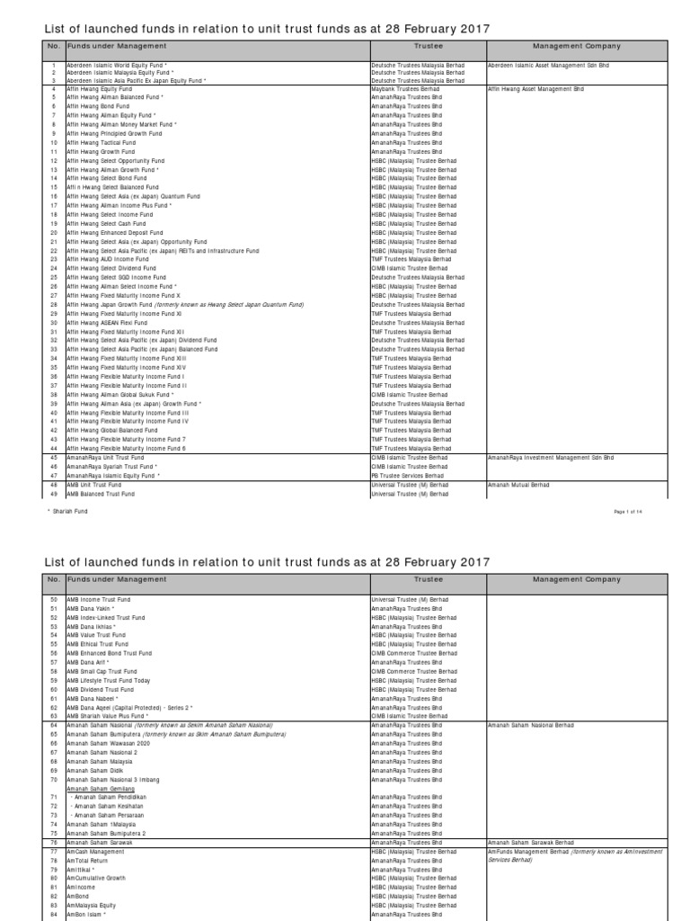 List Of Launched Funds In Relation To Unit Trust Funds As At 31 December Pdf Free Download