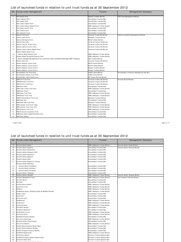 List Of Launched Funds In Relation To Unit Trust Funds As At 31 Pdf Document